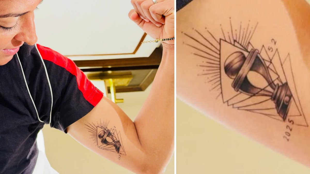 Last Updated:November 05, 2025, 11:44 ISTHarmanpreet Kaur celebrates leading India to the ICC Women's World Cup 2025 title with a trophy tattoo marked 2025 and 52, honoring the 52-run win over South Africa in Navi Mumbai.Harmanpreet Kaur got a new Tattoo after her leading the indian women’s cricket eam to a historic ICC women’s World Cup 2025 title.The Tattoo is of the World Cup trophy with the number 2025 and 52 on it – a reference to the year and the margin of the victory in the final.“Forever etched in my skin and my heart. Waited for you since Day 1 and now I will see you every morning and be grateful," she captioned the photo of her new Tattoo.SEE TATTOO:Also Read: Harmanpreet Kaur Toasts With Cup In Hand! Indian Fans Recall Abhinandan Varthaman And ‘Stolen’ Asia CupRealising Her Childhood DreamHarmanpreet’s lifelong dream finally came true on Sunday night as she lifted the Women’s World Cup trophy, leading India to a historic 52-run victory over South Africa in Navi Mumbai.After achieving her childhood ambition, the Indian captain shared a simple yet powerful message for the next generation: “Never stop dreaming. You never know where your destiny will take you."In a video released by the BCCI, Harmanpreet reflected on how her cricket journey began in her childhood, playing with her father’s bat, which was much too big for her at the time. “Ever since I started understanding likes and dislikes as a kid, I’ve always had a bat in my hand. I still remember we used to play with a bat from my dad’s kit bag. The bat was very big," she said.“One day, my dad cut an old bat of his to make it smaller for me. We used to play with it. Whenever we watched a match on TV, or saw India play, or watched the World Cup, I used to think, I need an opportunity like this. At that time, I didn’t even know about women’s cricket."Having waited almost twenty years for this moment, the 36-year-old captain expressed her overwhelming emotion and gratitude after the final. “Personally, it’s a very emotional moment because it was my dream since childhood. Ever since I started playing, it was my dream to win the World Cup one day. If I get an opportunity to lead my team, I don’t want to miss this opportunity," she said.“So, I said all these things from the bottom of my heart. And God heard everything one by one. It’s like magic. I don’t understand how suddenly everything fell into place. Everything kept happening one by one. Finally, we are world champions. I am feeling very relaxed, very humble, so grateful to God, for giving us this team, which we have been dreaming of for so many years, and we are living this moment."(With inputs from Agencies)News cricket Harmanpreet Kaur Unveils World Cup Trophy Tattoo: 'Forever Etched In My Skin And My Heart'